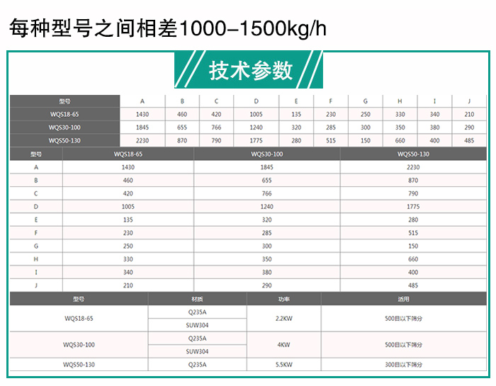 蔬菜粉臥式氣流篩分為三種型號(hào):WQS18-65,WQS30-100,WQS50-130,不同型號(hào)篩分過程中功率不同,產(chǎn)量也不相同,每種型號(hào)之間相差1000-1500kg/h,您可根據(jù)您的產(chǎn)量需求進(jìn)行選擇