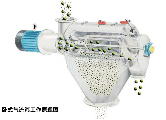 臥式氣流篩分機(jī)篩網(wǎng)為圓筒狀,置于機(jī)體內(nèi),物料通過螺旋輸送系統(tǒng)后,和氣流混合、霧化進(jìn)入網(wǎng)筒內(nèi);通過網(wǎng)筒內(nèi)風(fēng)輪葉片使物料同時(shí)受離心力和旋風(fēng)推進(jìn)力,從而近使物料噴射過網(wǎng),由細(xì)料排出口排出,不能過網(wǎng)的物料沿網(wǎng)筒壁從粗料排出口排出。