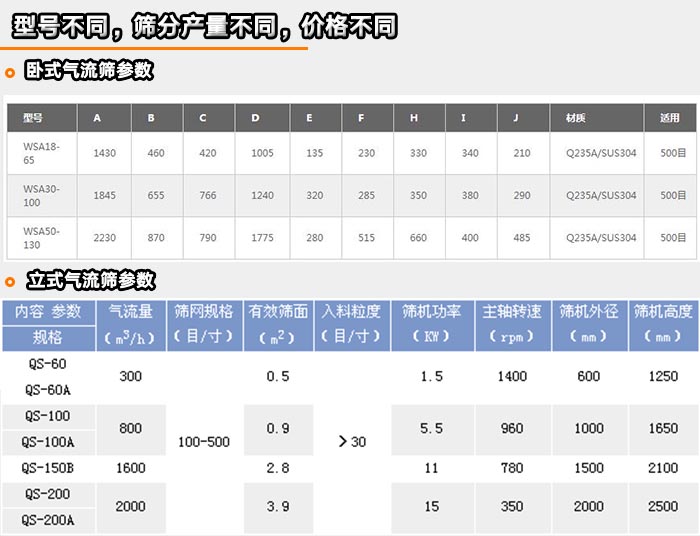氣流篩分機(jī)型號(hào)分為多種,LQS-600,LQS-1000,LQS-1600,WQS18-65,WQS30-100,WQS50-130等,型號(hào)不同,電機(jī)功率不同,所以氣流篩的篩分效率也存在差異,以此類推,價(jià)格也會(huì)受到相應(yīng)的影響,就會(huì)出現(xiàn)有高價(jià)有低價(jià)