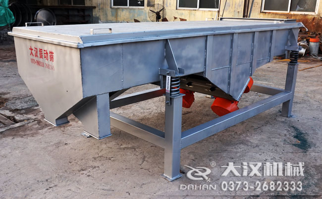 本品為1000mm(寬)x1600mm(長)單層兩個出料口碳鋼材質(zhì)鐵質(zhì)網(wǎng)架結(jié)構(gòu)直線震動篩。(此機是客戶定制篩分機)。